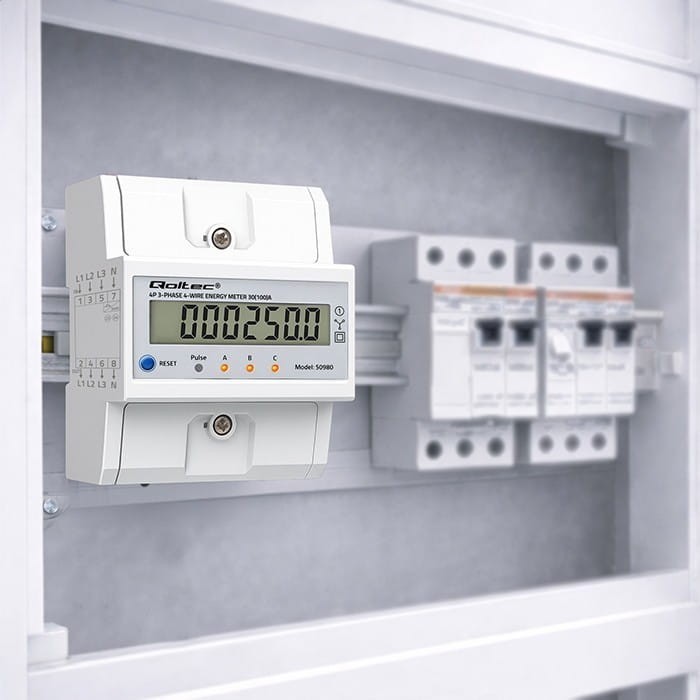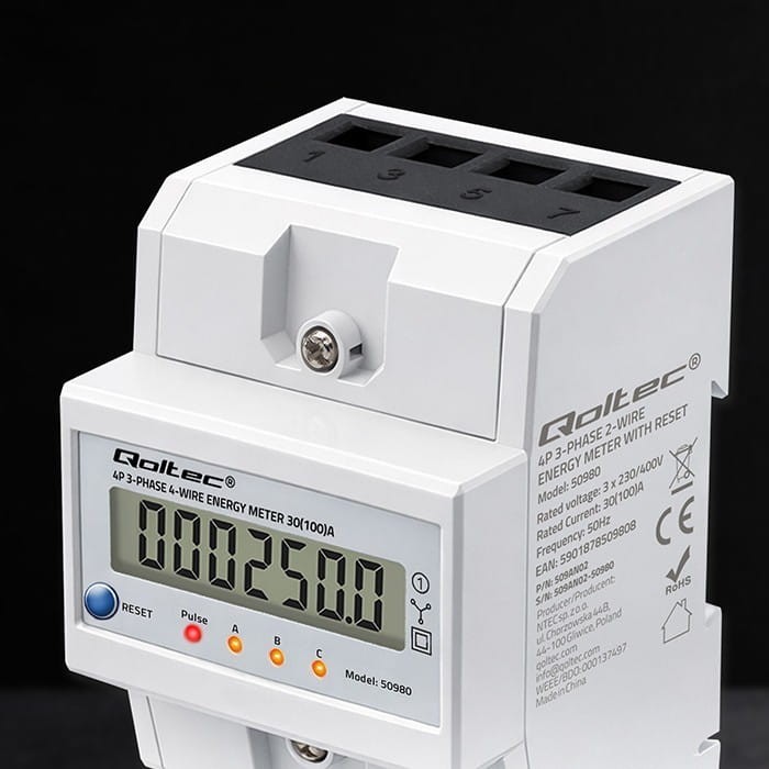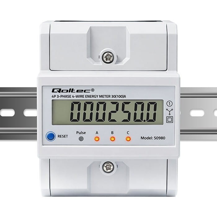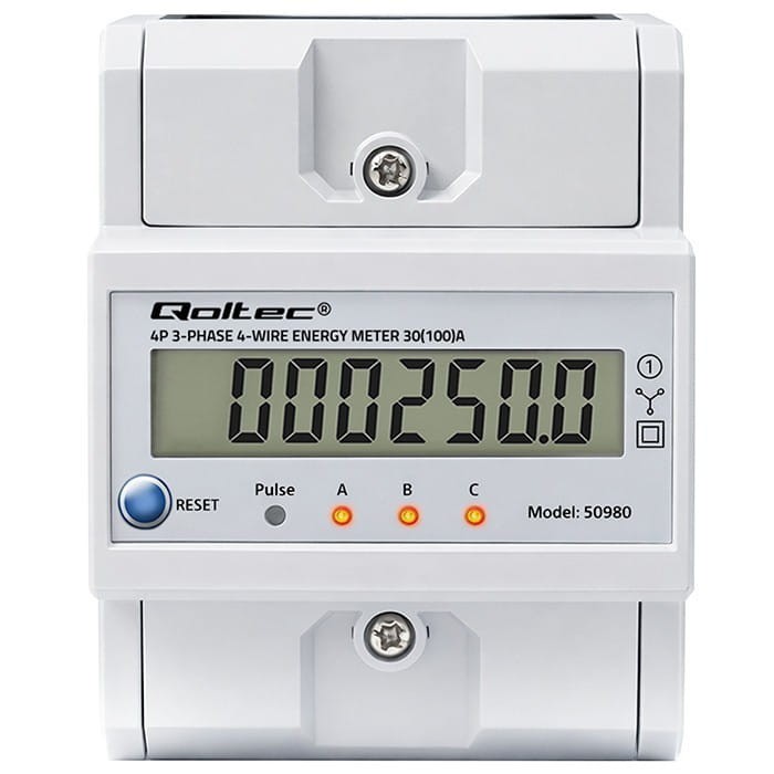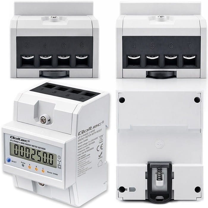 Qoltec Trójfazowy elektroniczny licznik z resetem | miernik zużycia energii na szynę DIN | 400V | 100A | LCD | LED | 4P