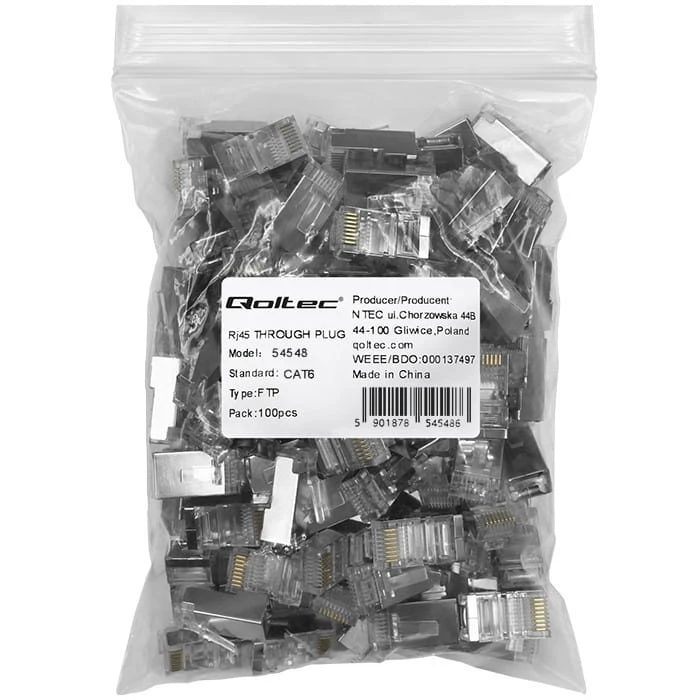 Qoltec Wtyk przelotowy złącze RJ45 | CAT6 | FTP | Pass Through | Pozłacane styki | 100 sztuk