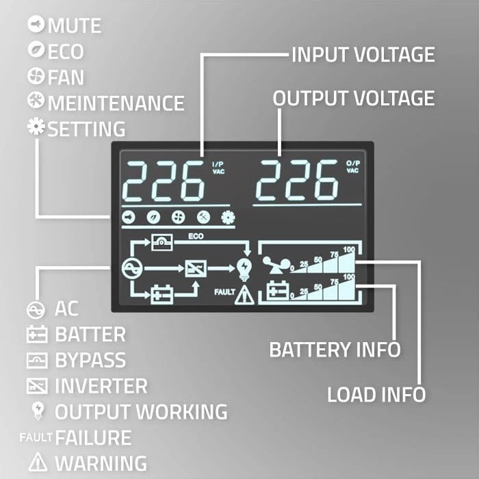 Dzięki zintegrowanemu wyświetlaczowi LCD zarządzanie urządzeniem staje się intuicyjne i wygodne. Na ekranie otrzymujesz aktualne informacje dotyczące statusu pracy oraz kluczowych parametrów zasilacza. To gwarantuje, że będziesz na bieżąco z działaniem urządzenia, co umożliwia szybką reakcję na ewentualne problemy oraz optymalne dostosowanie pracy do potrzeb. Praca z zasilaczem staje się łatwa, szybka i niezawodna, co pozwala skoncentrować się na głównych zadaniach bez obaw o stabilność zasilania.