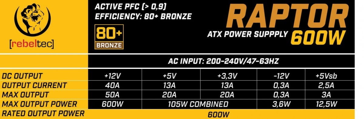 Rebeltec Zasilacz ATX RAPTOR 600W BRONZE 80+,Single Rail, DC-DC