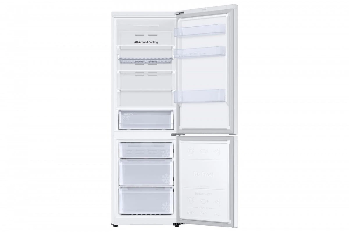- Technologia pełnego No Frost marki Samsung zapewnia stały obieg chłodnego powietrza, systematycznie usuwając nadmiar wilgoci z wnętrza lodówki. Dzięki temu lód i szron nie osadzają się na ściankach czy produktach. Żywność zachowuje świeżość i wartości odżywcze na dłużej, a utrzymanie czystości jest łatwiejsze bez rozmrażania.