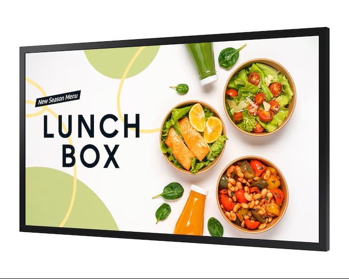 Ultracienki ekran Window Signage o grubości 45,6 mm sprawia, że OM32DX jest najcieńszy w swojej klasie. Jego cienka konstrukcja pozwala na instalację w różnych środowiskach, zapewniając estetyczną przestrzeń. Elegancki design wpływa na doskonałe wrażenia wizualne, płynnie integrując się z otoczeniem biznesowym.
