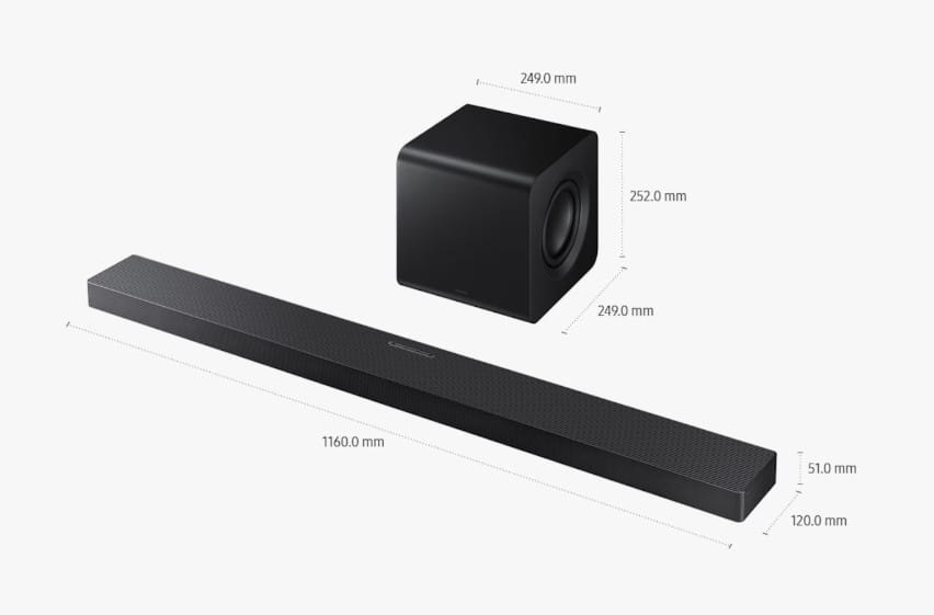 Wymiary: Jednostka główna (SxWxG): 1160.0 x 51.0 x 120.0 mm Głośnik niskotonowy (SxWxG): 249.0 x 252.0 x 249.0 mm