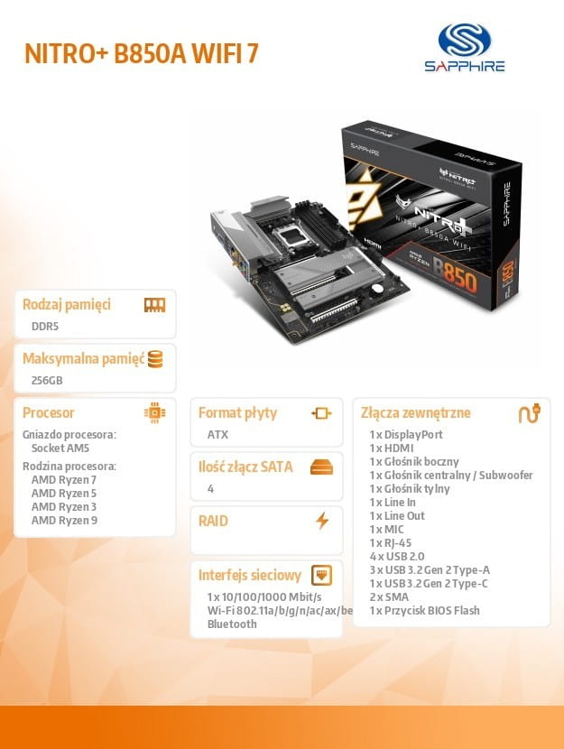 Sapphire Technology Płyta główna NITRO+ B850A WIFI7 AM5 4DDR5 mATX