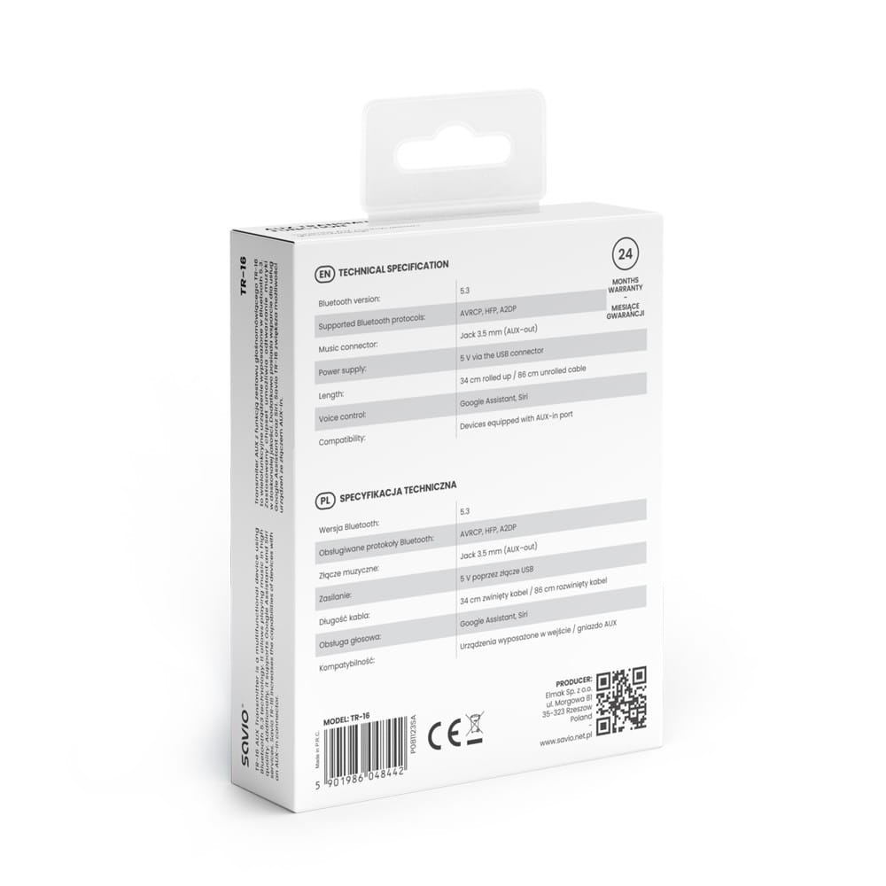 Transmiter TR-16, to wielofunkcyjne akcesorium elektroniczne, które wyposażono w Bluetooth 5.3. Zastosowany chipset umożliwia odtwarzanie muzyki w doskonałej jakości, a złącze AUX-in zwiększa sposoby jego użytkowania. Co istotne, posiada on dodatkowo wsparcie dla usług Google Assistant oraz Siri.