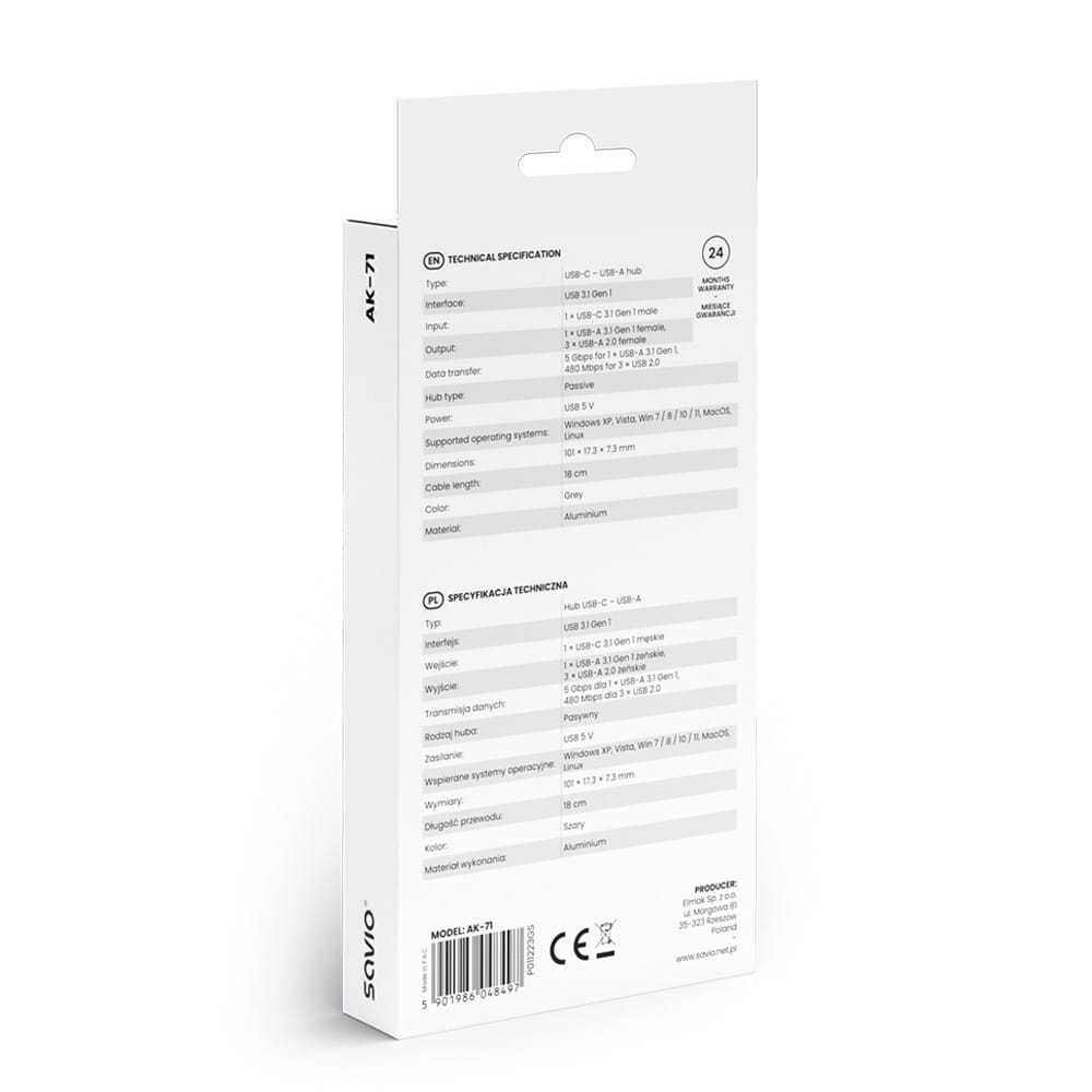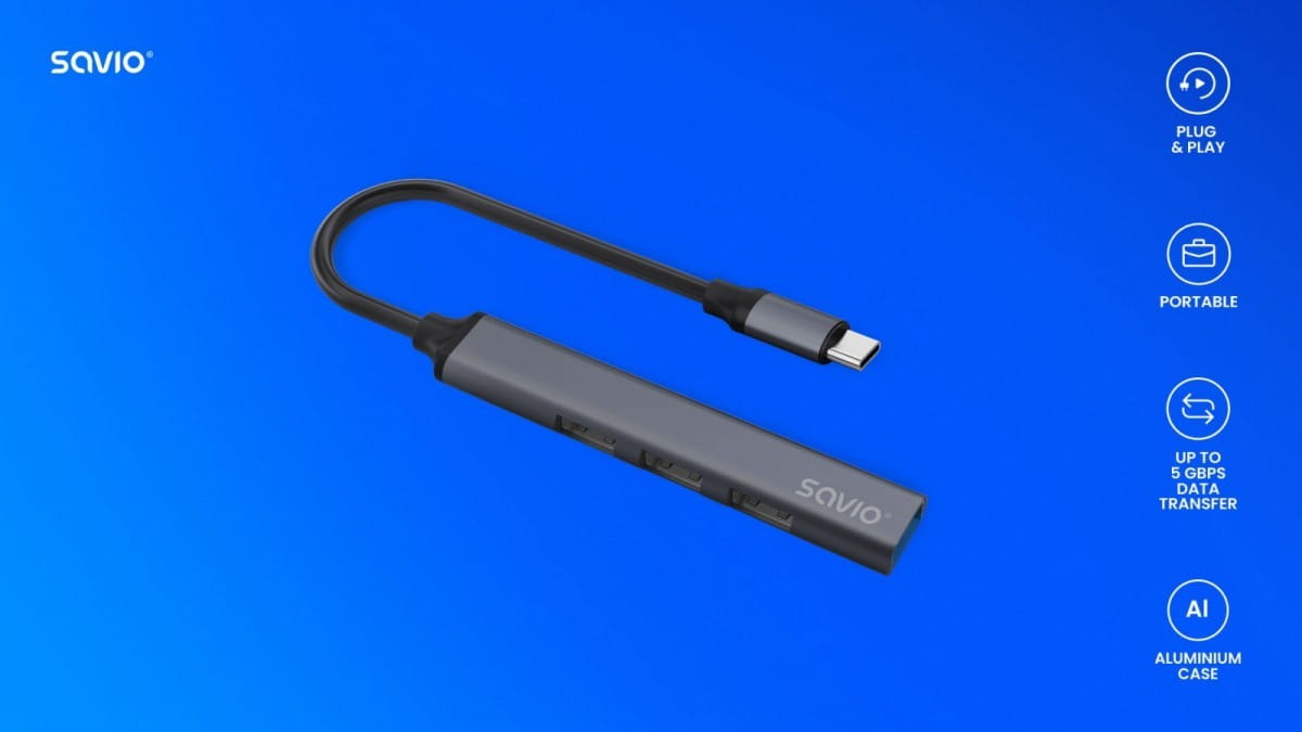 Savio Hub 4 porty USB-C - 3 x USB-A 2.0, 1 x USB-A 3.1 3.1 GEN 1, 5 Gbps, AK-71