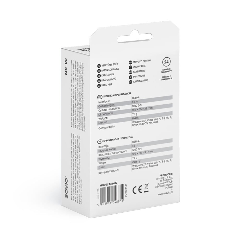 Mysz Savio MB-02 jest niezwykle prosta w obsłudze wystarczy podłączyć ją do komputera przez kabel USB-A, aby natychmiast rozpocząć pracę. Technologia Plug & Play eliminuje potrzebę instalacji dodatkowego oprogramowania. Długość kabla 1,6 metra zapewnia swobodę ruchów, nawet w przypadku większych stanowisk pracy.