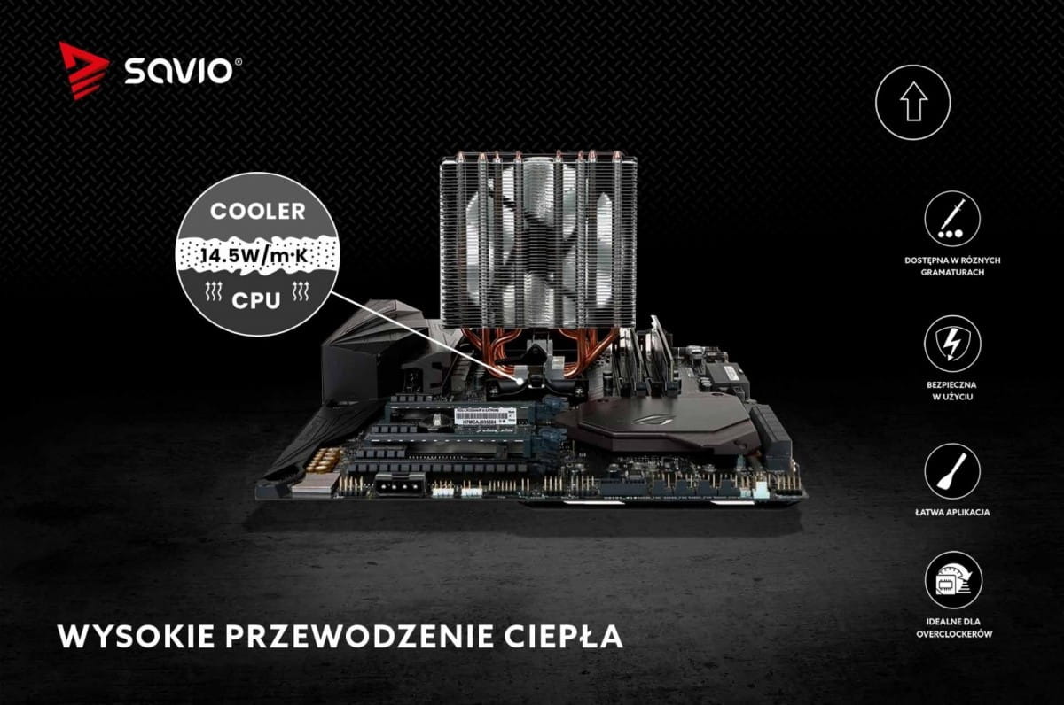 Pasta termoprzewodząca od Savio dzięki zawartym w niej tlenkom metali nie przewodzi prądu, ale świetnie przewodzi ciepło. Eliminuje to w całości ryzyko zwarcia oraz redukuje uszkodzenia korozyjne podstawy radiatora i IHS.