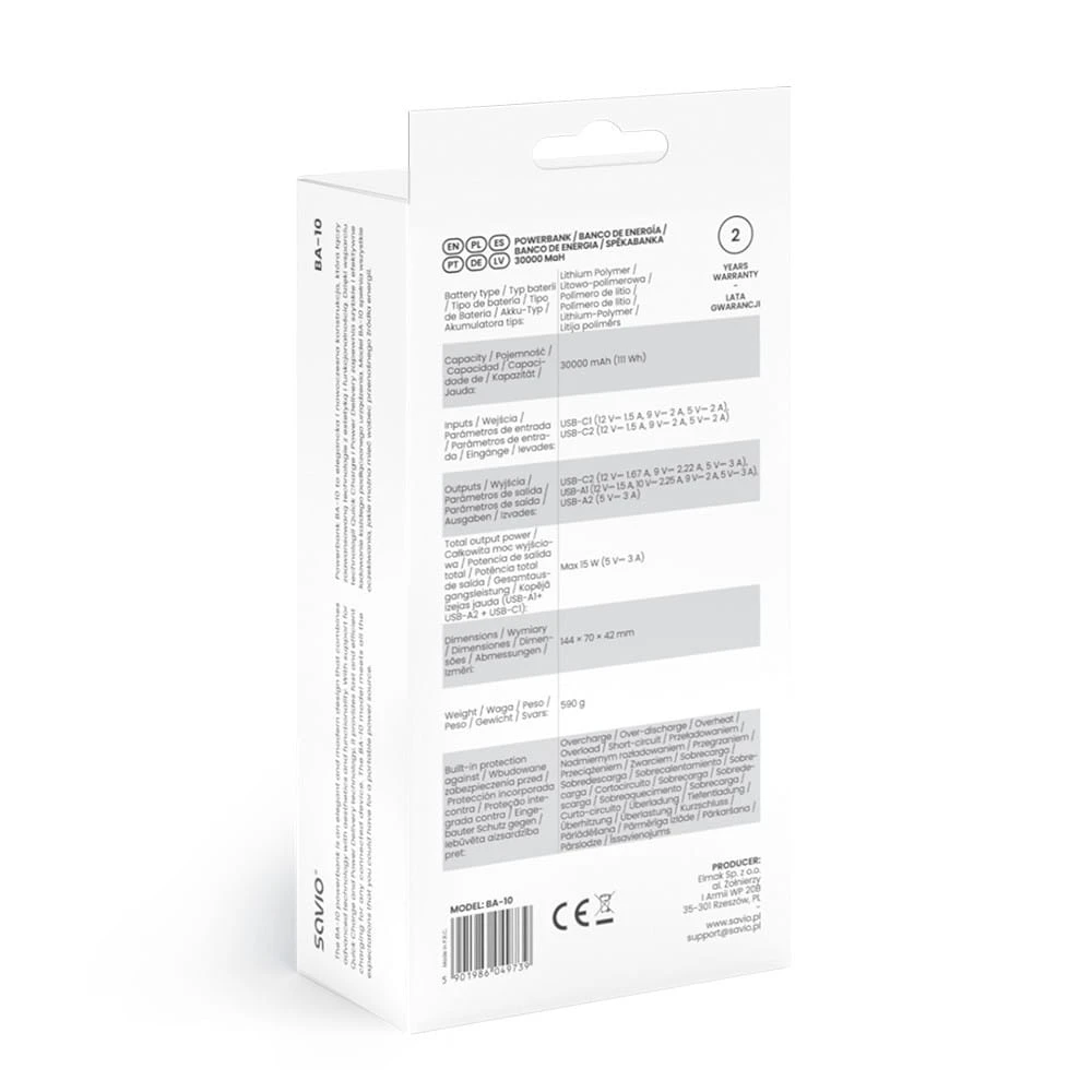 Akcesoria w zestawie: Powerbank SAVIO SAVIO BA-10 30000 mAh (111 Wh), Kabel USB-A USB-C 2 A 30 cm, Instrukcja obsługi