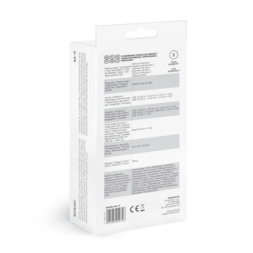 Akcesoria w zestawie: Powerbank SAVIO SAVIO BA-10/BA-11 30000 mAh (111 Wh), Kabel USB-A USB-C 2 A 30 cm, Instrukcja obsługi