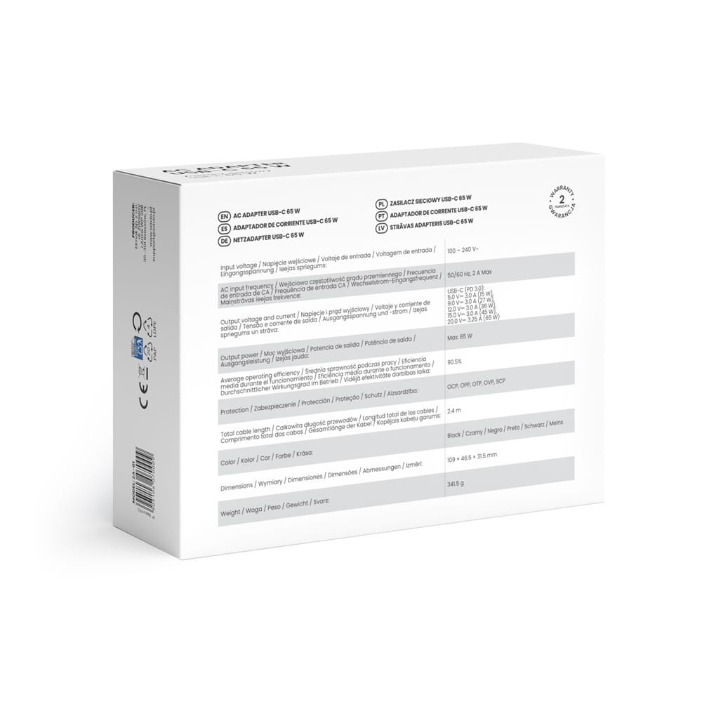 Pozostałe parametry: Napięcie wejściowe: 100-240 V~ Wejściowa częstotliwość prądu przemiennego: 50 / 60 Hz, 2 A Max Napięcie i prąd wyjściowy: USB-C (PD 3.0): 5.0 V 3.0 A (15 W), 9.0 V 3.0 A (27 W), 12.0 V 3.0 A (36 W), 15.0 V 3.0 A (45 W), 20.0 V 3.25 A (65 W) Moc wyjściowa: Max: 65 W Średnia sprawność podczas pracy: 90.5% Zabezpieczenie: OCP, OPP, OTP, OVP, SCP