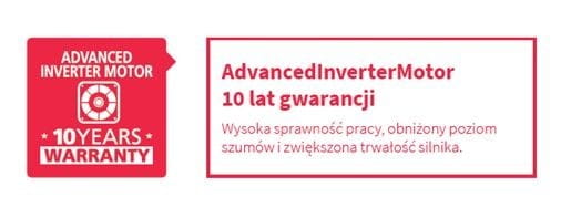 - AdvancedInverterMotor silnik inwerterowy, wysoka sprawność pracy, obniżony poziom szumów i zwiększona trwałość silnika.