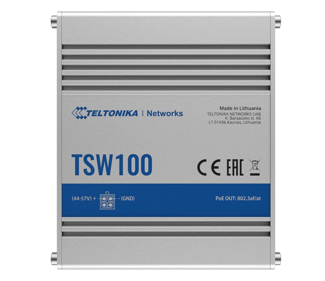 TSW100 to bardzo popularny, pierwszy przemysłowy, przełącznik niezarządzalny firmy Teltonika Networks. Wyposażony jest on w pięć portów Gigabit Ethernet, z których cztery obsługują standardy IEEE802.3af i IEEE802.3at Power-over-Ethernet (PoE). Umożliwia centralizację zasilania, zapewniając do 30 watów na port, zmniejszając wysiłek związany z instalacją zasilania.