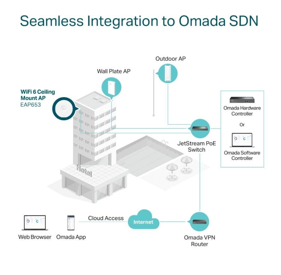 - Scentralizowane zarządzanie w Chmurze: Integracja z platformą Omada SDN pozwala na zarządzanie siecią lokalnie i zdalnie z Chmury przez interfejs Web lub aplikację Omada.