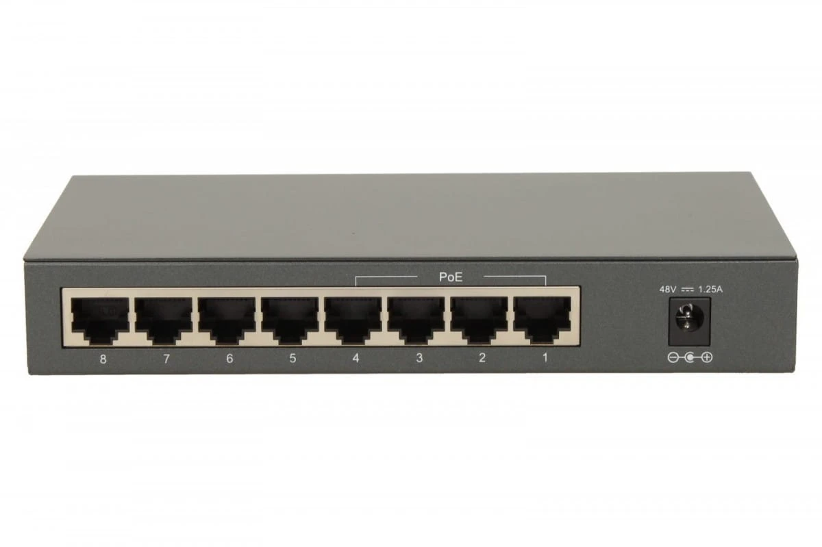 - Porty: 8 portów 10/100M RJ45, w tym 4 porty PoE (1-4), automatyczna negocjacja prędkości połączeń, automatyczne krosowanie MDI/MDIX