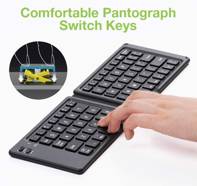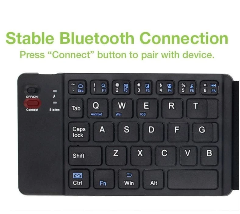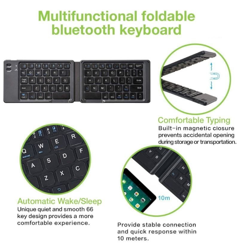 - Składana klawiatura Bluetooth V3.0: standardowy rozmiar poprawia wydajność pisania i wygodę; dzięki niewielkiej wadze i niewielkim rozmiarom po złożeniu można ją łatwo zabrać ze sobą wszędzie, aby łatwo używać jej ze smartfonami i tabletami. Technologia Bluetooth zapewnia bezprzewodowe połączenie w zasięgu 10 metrów.