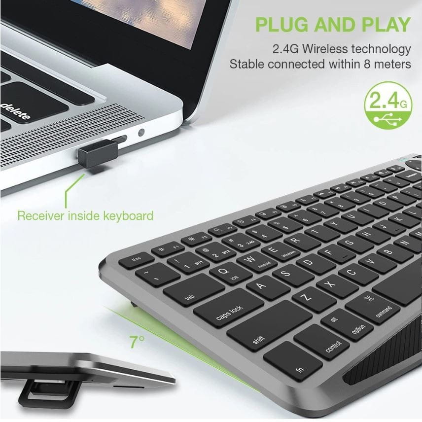 - Technologia 2,4 GHz tej klawiatury zapewnia silne i niezawodne połączenie; Plug and play, nie jest wymagana instalacja sterownika. Wystarczy podłączyć mały odbiornik USB typu A, a klawiatura jest gotowa do użycia.