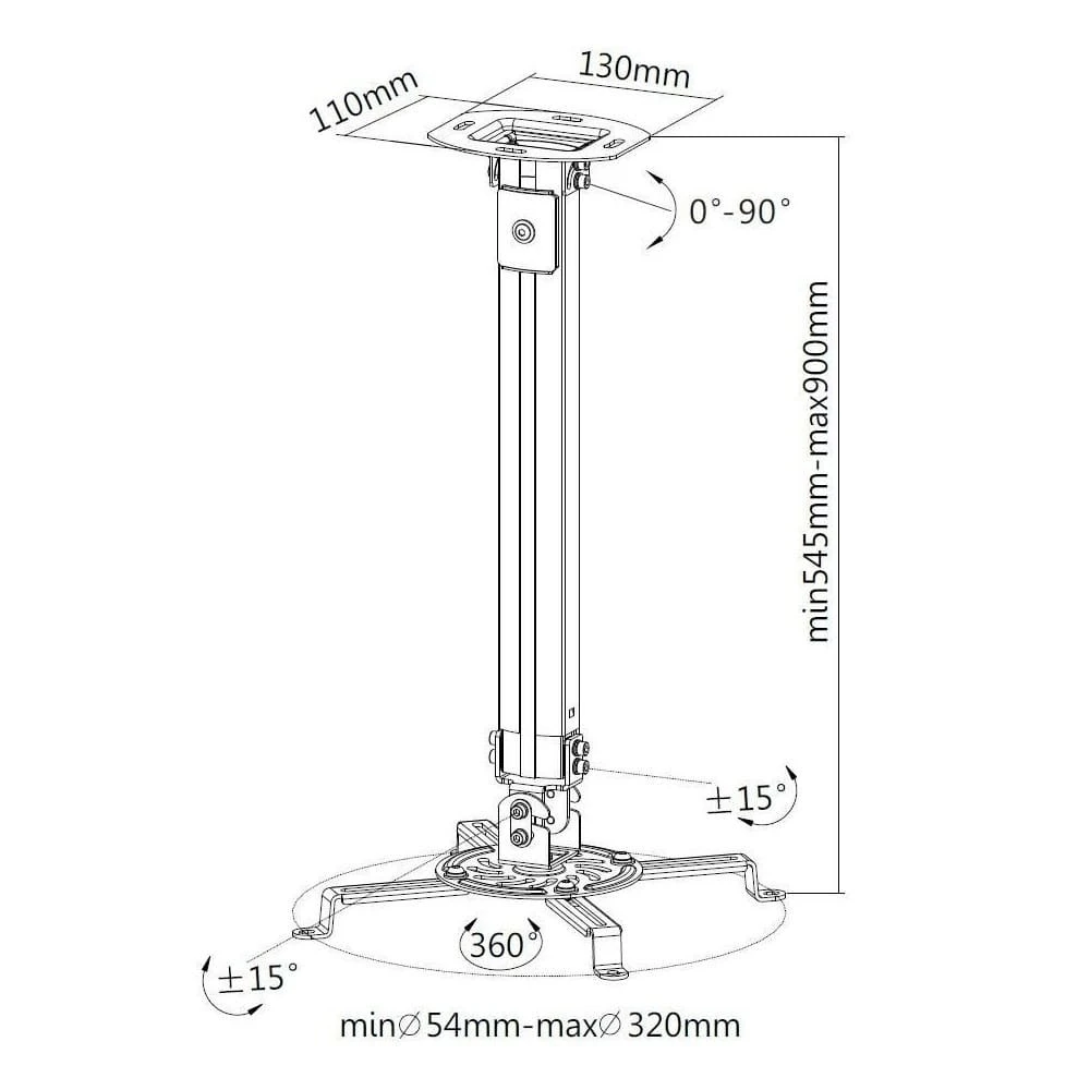 Pozostałe parametry: - Regulacja kąta pochylenia względem płaszczyzny sufitu: 0° - 90°- Minimalny rozstaw (średnica) nóżek mocujących: 54 mm- Maksymalny rozstaw (średnica) nóżek mocujących: 320 mm