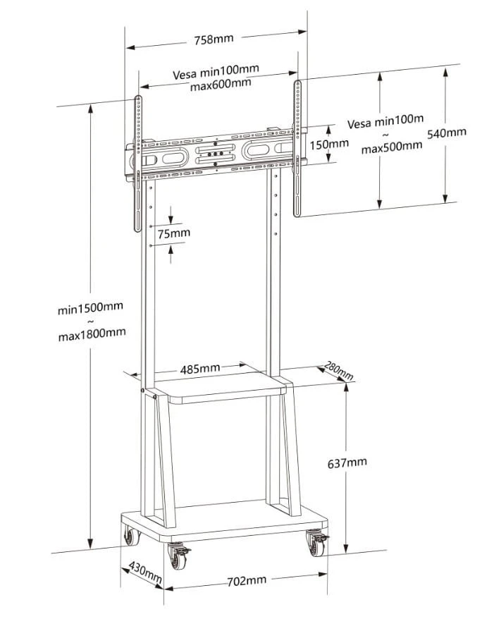 - Uchwyt na telewizor regulowany w 2 pozycjach; całkowita wysokość wózka: 1800 mm.