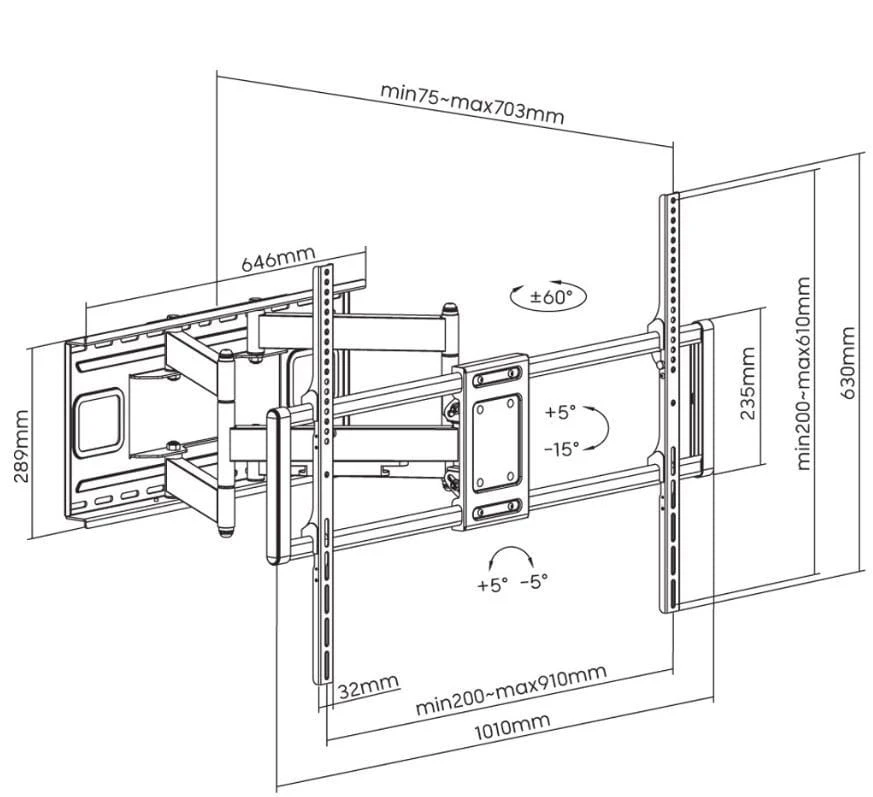 - Możliwość wydłużenia ramienia do 703 mm i obrotu o 120°