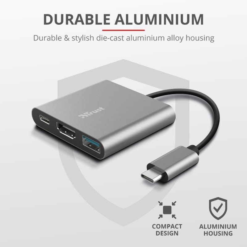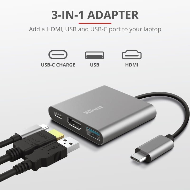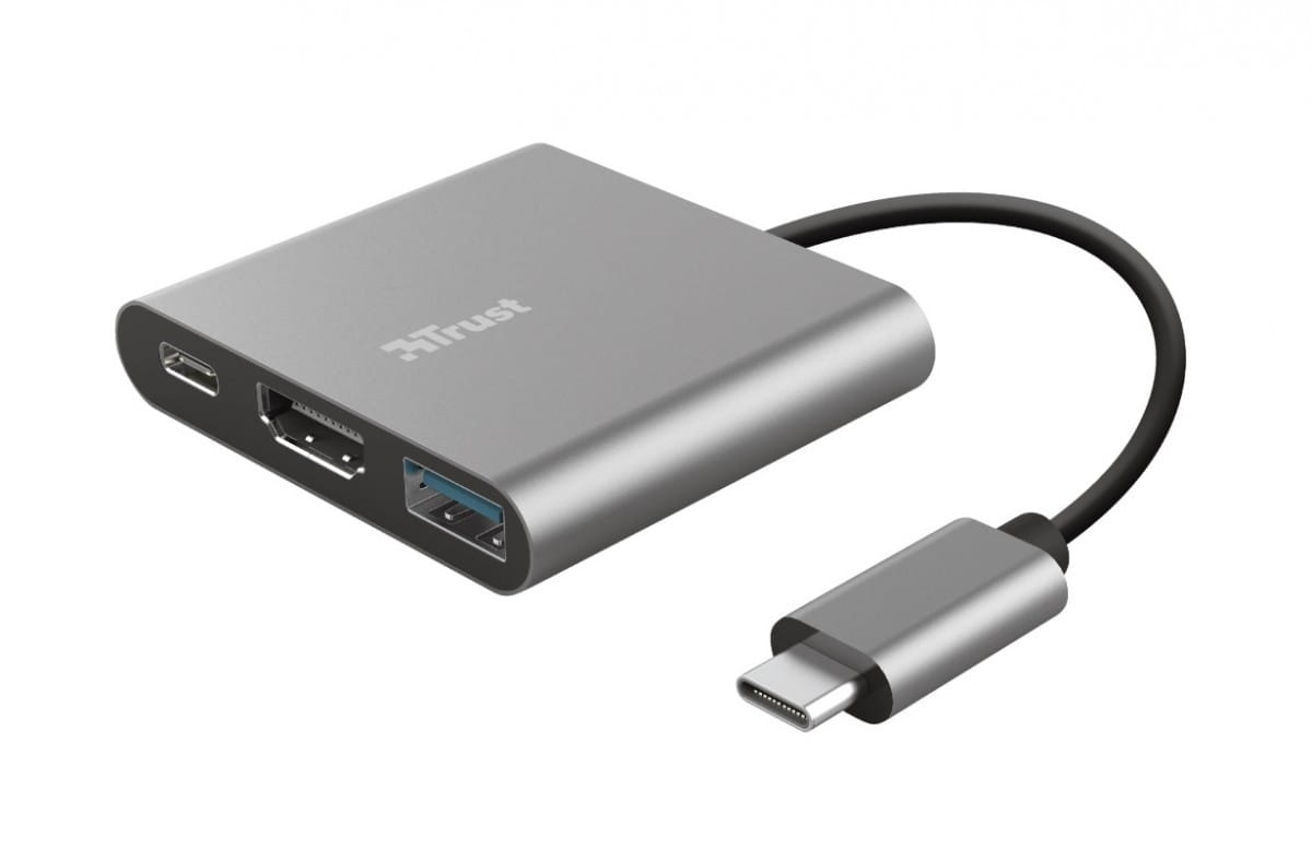 - Dzięki Trust Dalyx 3-w-1 Multiport Adapter USB-C możesz naprawdę wydobyć maksimum ze swojego laptopa. Zwiększ liczbę portów w swoim laptopie i połącz się z wieloma urządzeniami przez port HDMI, USB-A i USB-C do ładowania.