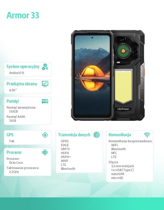 Certyfikaty IP69K i IP68 gwarantują doskonałą ochronę przed kurzem, wodą i cieczami pod wysokim ciśnieniem. Ponadto certyfikat MIL-STD-810H potwierdza, że Armor 33 może z łatwością wytrzymać upadki, wstrząsy i najtrudniejsze warunki.