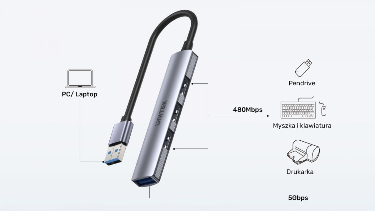 Jak podłączyć aż cztery urządzenia do jednego portu USB? To proste jedyne czego potrzebujesz to hub USB Unitek H1208A! Dzięki temu akcesorium raz na zawsze pozbędziesz się problemu brakujących portów USB i zapomnisz o irytującym przepinaniu kabli w komputerze, samochodzie lub konsoli do gier!