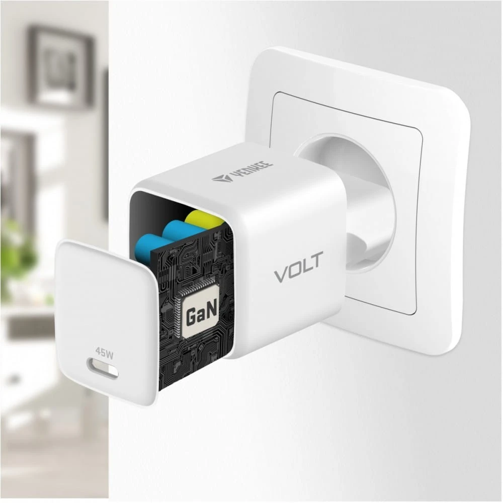 Ładowarka GaN VOLT oferuje wysoką wydajność, kompaktowy rozmiar i wszechstronne zastosowanie. Szybkie i bezpieczne ładowanie urządzeń mobilnych zapewniają dwa złącza wyjściowe USB typu C o maksymalnej mocy 45 W oraz obsługa protokołów ładowania QC 4.0+, PD 3.0, AFC, FCP i innych. Nie potrzebujesz już różnych ładowarek do różnych urządzeń. Uniwersalna ładowarka VOLT pasuje do większości urządzeń mobilnych, takich jak telefony, tablety i inne akcesoria elektroniczne. Polegaj na bezpiecznym i szybkim ładowaniu dzięki obsłudze protokołów ładowania