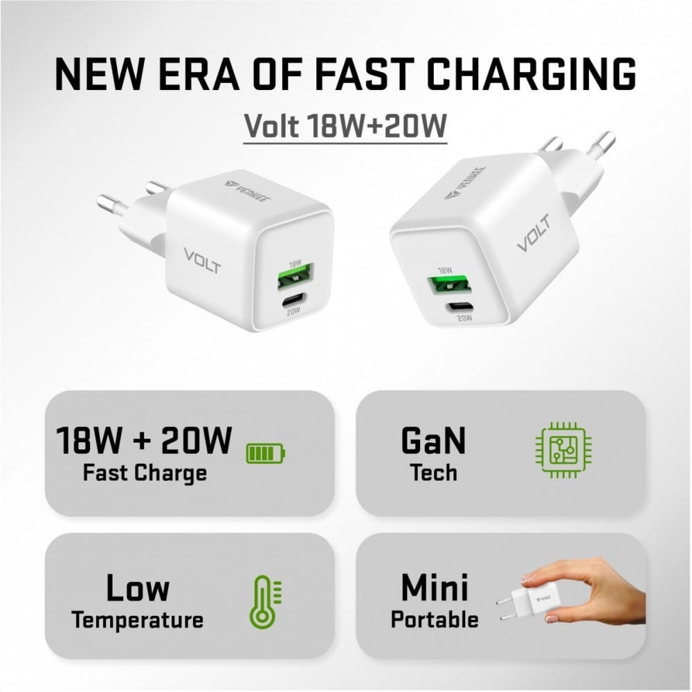 Ładowarka GaN VOLT oferuje wysoką wydajność, kompaktowy rozmiar i wszechstronne zastosowanie. Szybkie i bezpieczne ładowanie urządzeń mobilnych zapewniają dwa złącza wyjściowe USB A + USB C o maksymalnej mocy do 20 W oraz obsługa protokołów ładowania QC 3.0, PD 3.0, AFC, FCP i innych. Nie potrzebujesz już różnych ładowarek do różnych urządzeń. Uniwersalna ładowarka VOLT pasuje do większości urządzeń mobilnych, takich jak telefony, tablety i inne akcesoria elektroniczne. Polegaj na bezpiecznym i szybkim ładowaniu dzięki obsłudze protokołów ładowania