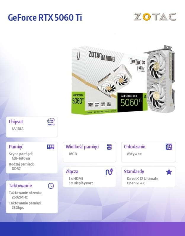 ZOTAC GAMING GeForce RTX 5060 Ti 16GB Twin Edge OC White Edition to kompaktowa karta graficzna oparta na nowoczesnej architekturze NVIDIA Blackwell, wyposażona w DLSS 4 oraz 16 GB pamięci GDDR7. Dzięki fabrycznemu podkręceniu i solidnemu systemowi chłodzenia, model Twin Edge OC White Edition jest gotowy, aby sprostać najnowszym grom, zapewniając płynną rozgrywkę i wysoką wydajność.
