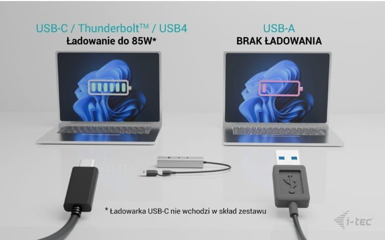 - HUB może ładować notebooka/tablet z mocą do 85W